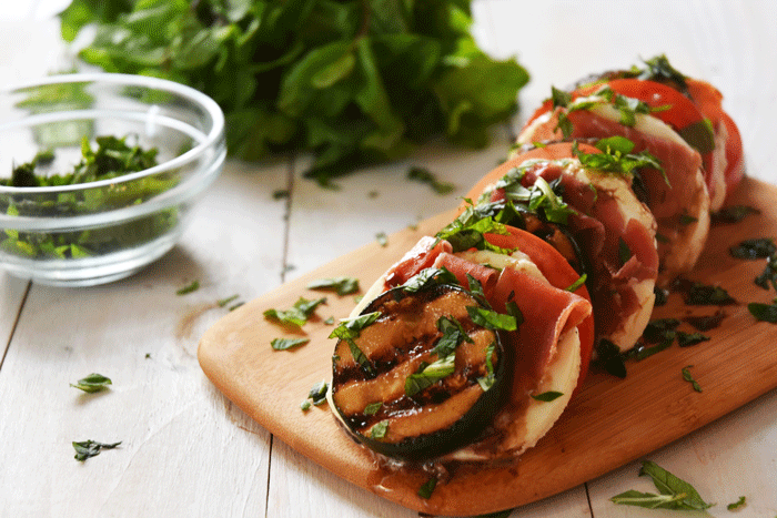 - Next, sprinkle the tomato slices with the remaining ¼ teaspoon of salt. Assemble the salad on a plate, layering the ingredients as follows: 1 grilled zucchini slice, 1 prosciutto slice, 1 mozzarella slice, and finally 1 tomato slice. Repeat this sequence until all of the slices have been used, then sprinkle the salad with the basil and mint, and drizzle the remaining marinade over the top.